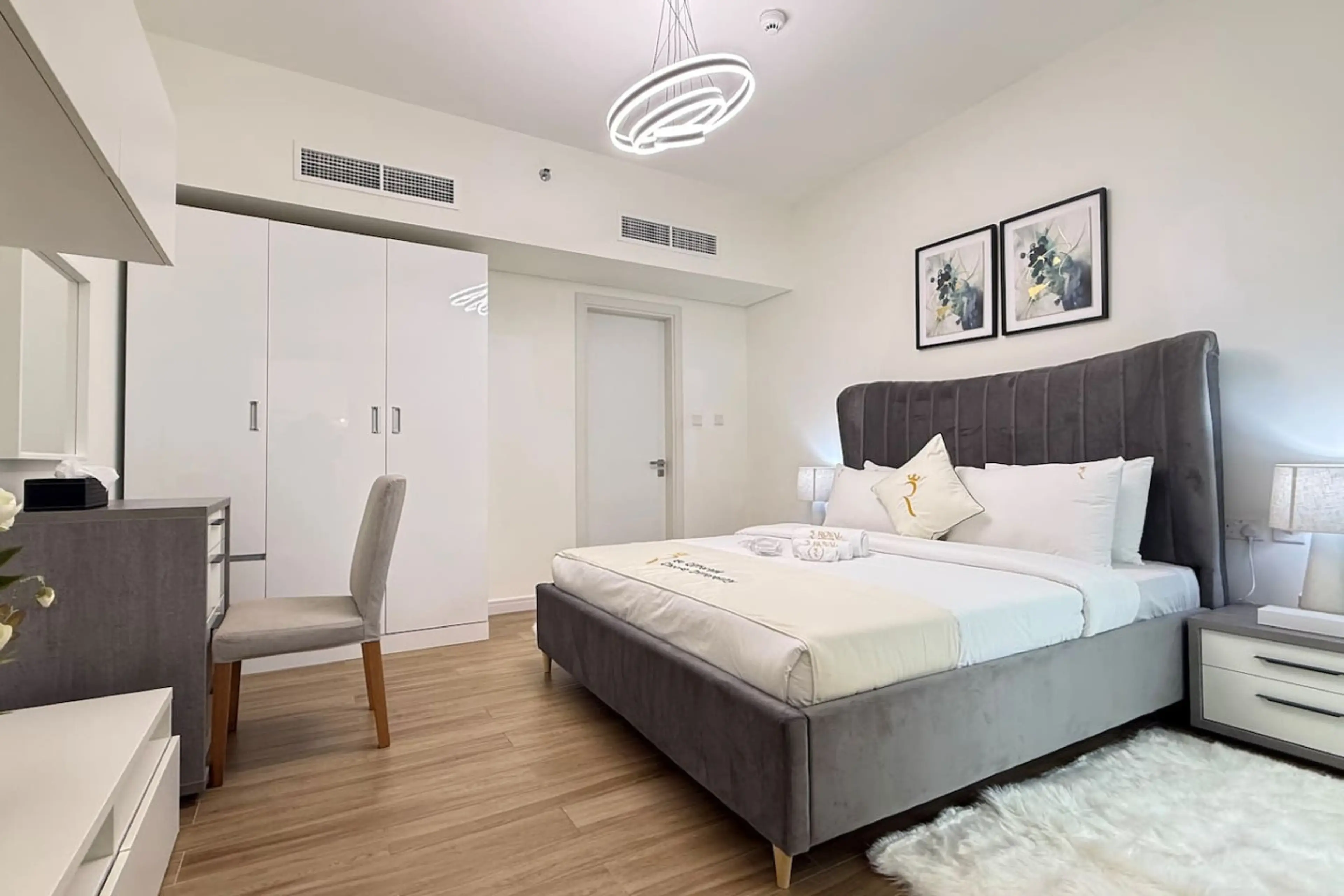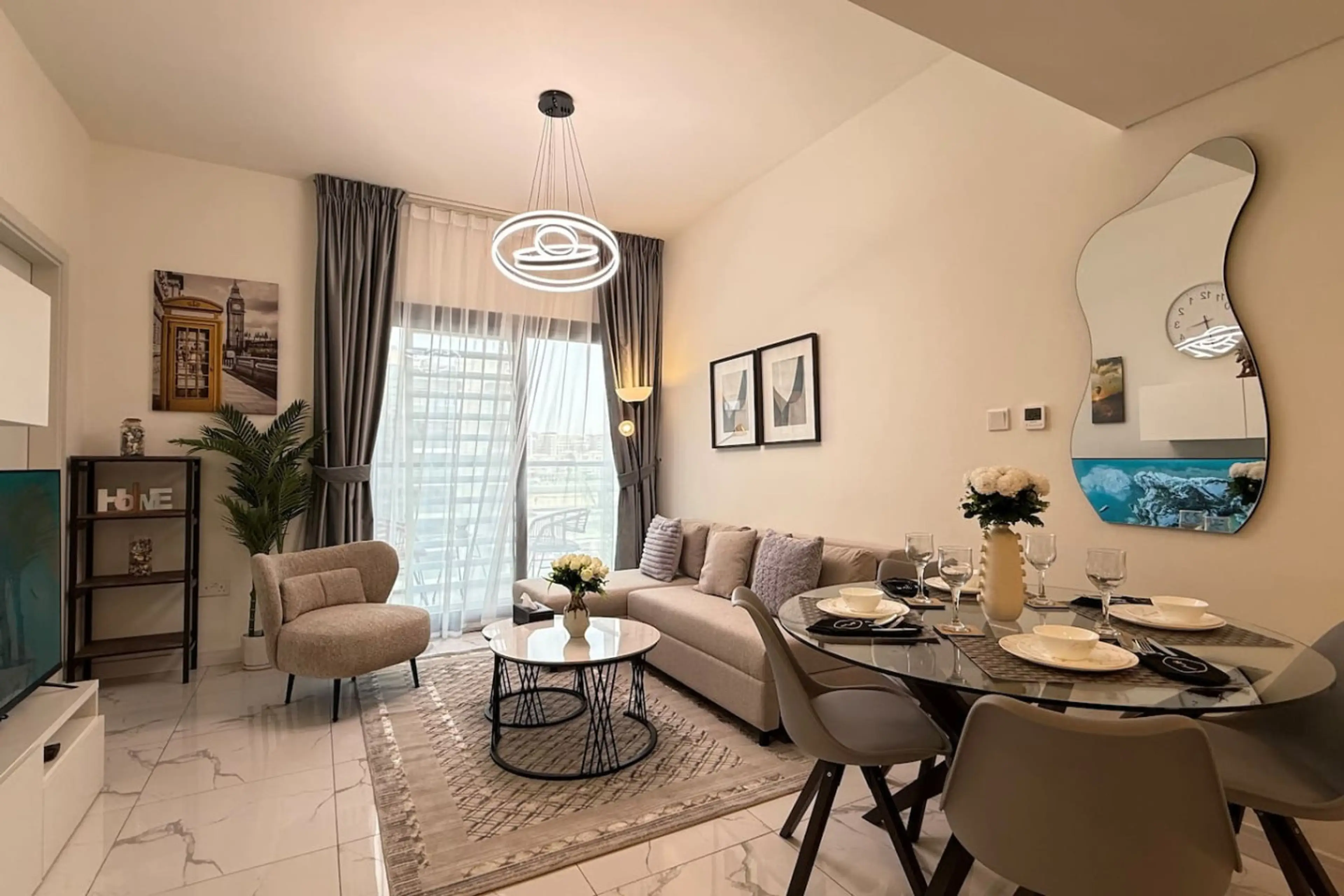 Welcome to our modern 1BR apartment in Raha Lofts—perfect for up to 3 guests. Enjoy a king-size bed, a comfy sofa bed in the living room with a smart TV, a fully equipped kitchen, and a dining area for 4. The apartment offers 1.5 bathrooms stocked with toiletries, a private balcony, free Wi-Fi, and ...