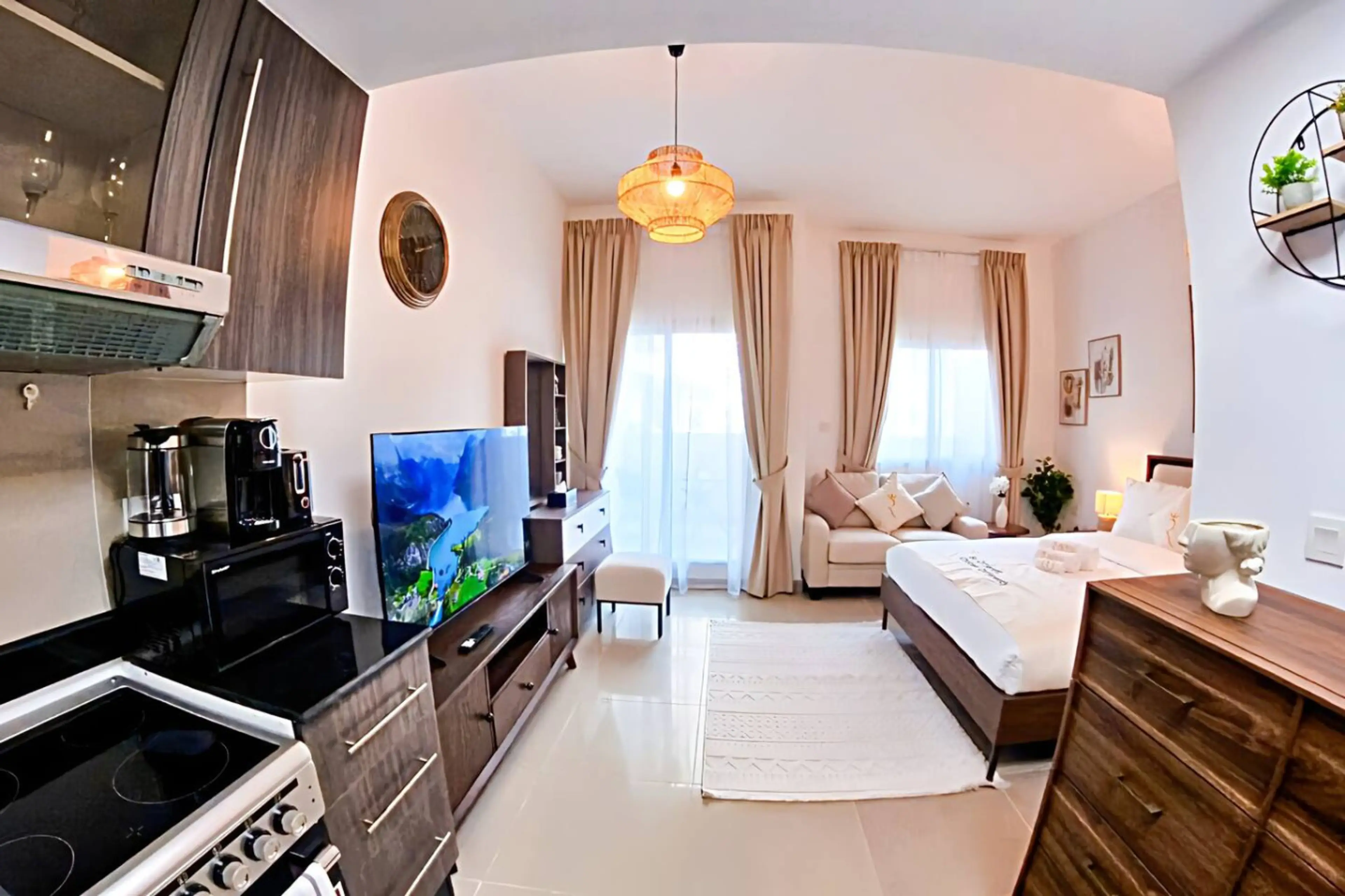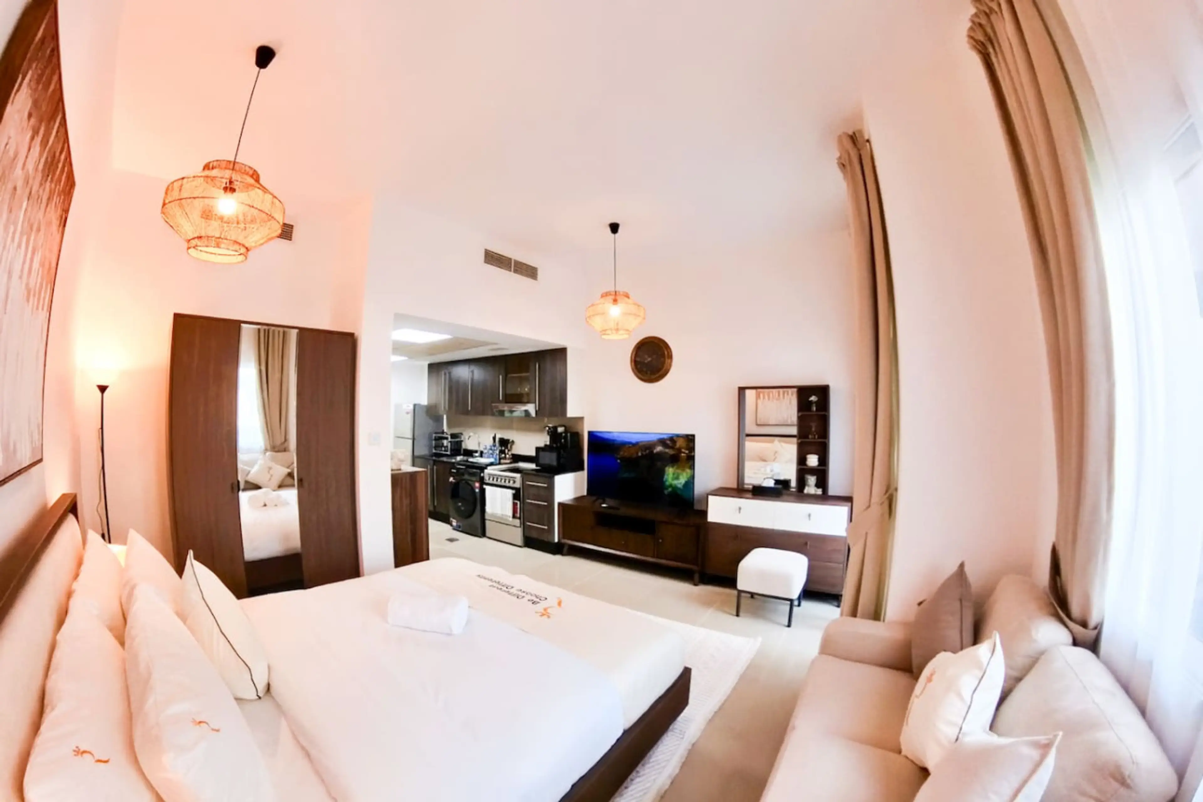 Welcome to your serene escape in Abu Dhabi – a cozy, peach-themed studio in Al Reef Downtown. This stylish space features a king-size bed, open kitchen, balcony with seating, and a bathroom with a relaxing bathtub. Enjoy modern comforts like a large-screen TV, fast Wi-Fi, and a dressing area. Guests...